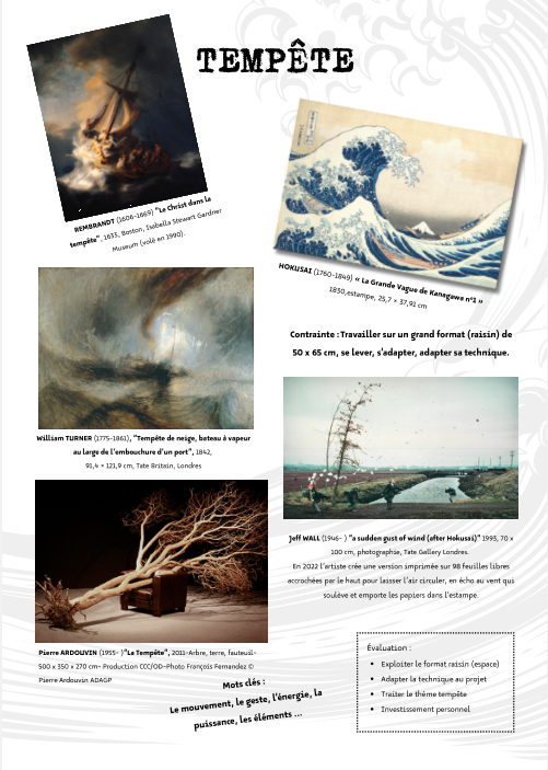 Cette semaine vous avez pu découvrir de nouvelles créations dans le Cube d’exposition du collège. Cette sélection est le fruit du travail des élèves de 3eme sur la thématique de la TEMPÊTE et se veut représentative de toutes les pistes explorées.